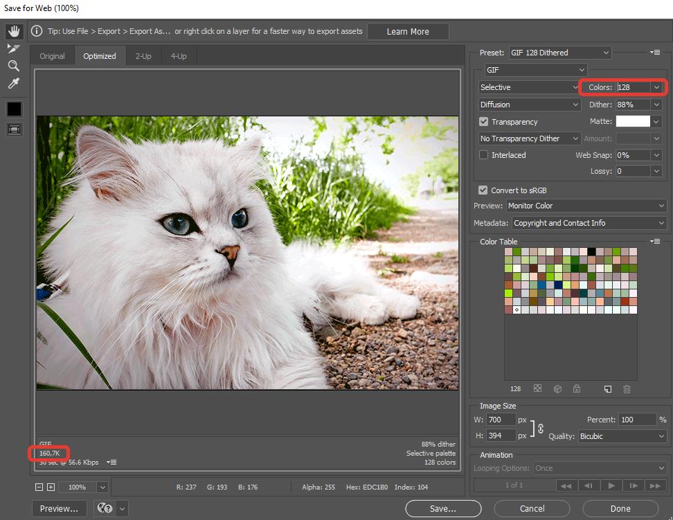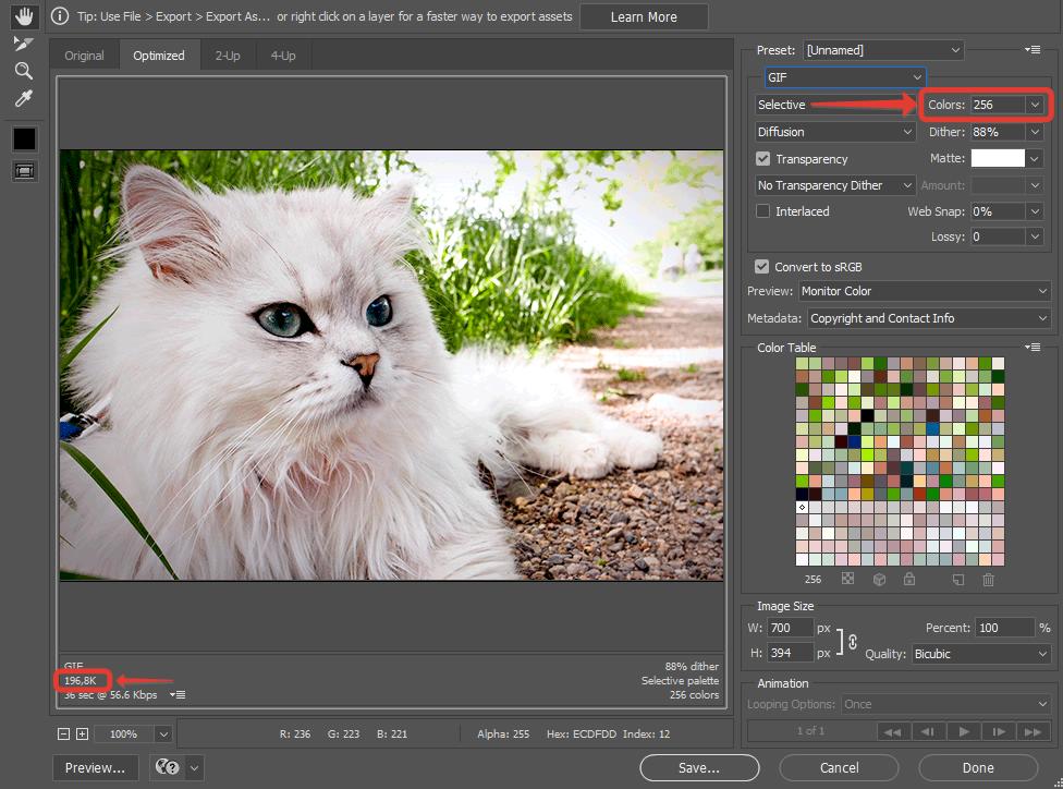 Если сохранять картинку с помощью какого-нибудь графического редактора, используя разное количество цветов, то можно увидеть, что вес картинки при сохранении с использованием 256 цветов будет выше, чем при использовании 128 цветов (что логично).
