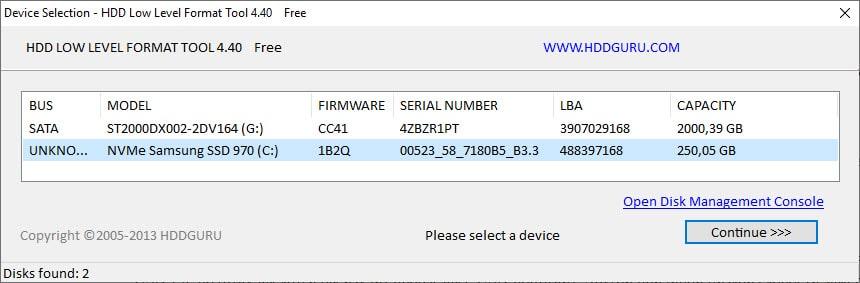 - Запустите Low Level Format Tool и щелкните по “Continue for free” (запуск бесплатной версии).
