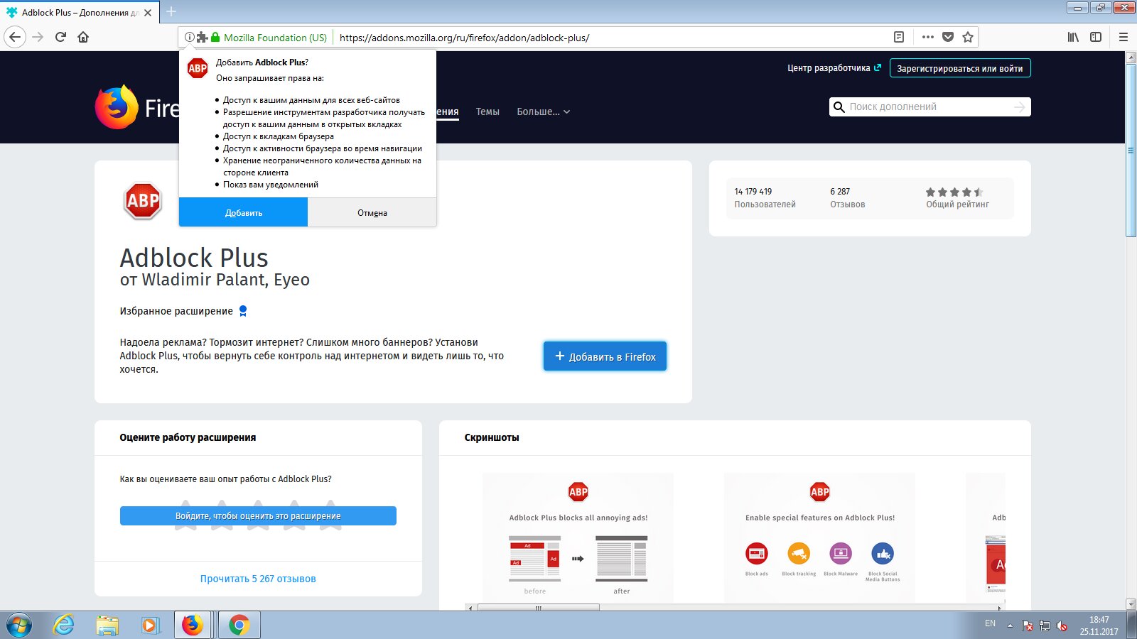 Если вы используете браузер Mozilla Firefox — щёлкните на кнопку установки на странице установки для Firefox. Firefox спросит разрешения установить расширение Adblock Plus: нажмите «Разрешить».