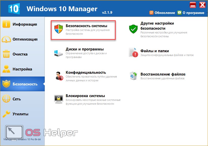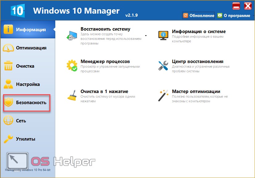 Данная программа позволит отключить UAC за несколько шагов. Скачать и установить ее можно совершенно бесплатно. После инсталляции запустите Windows 10 Manager и выполните следующие действия: