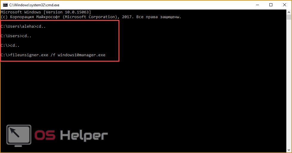 - Вводите команду «cd» до тех пор, пока не попадете в корневой каталог системного раздела. Впишите команду «FileUnsigner.exe /f» и название второго файла, после чего нажмите Enter