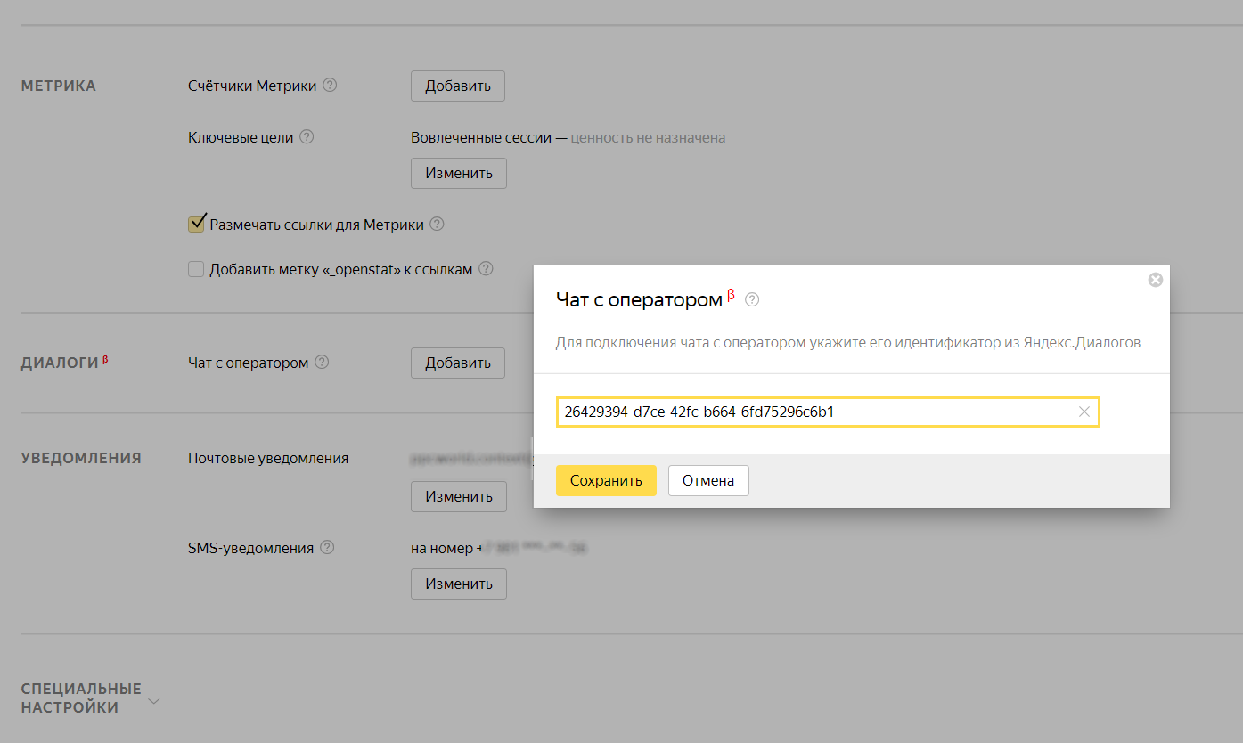 10. После этого следует перейти в Директ и добавить номер идентификатора в поле «Диалоги» в параметрах кампании.
