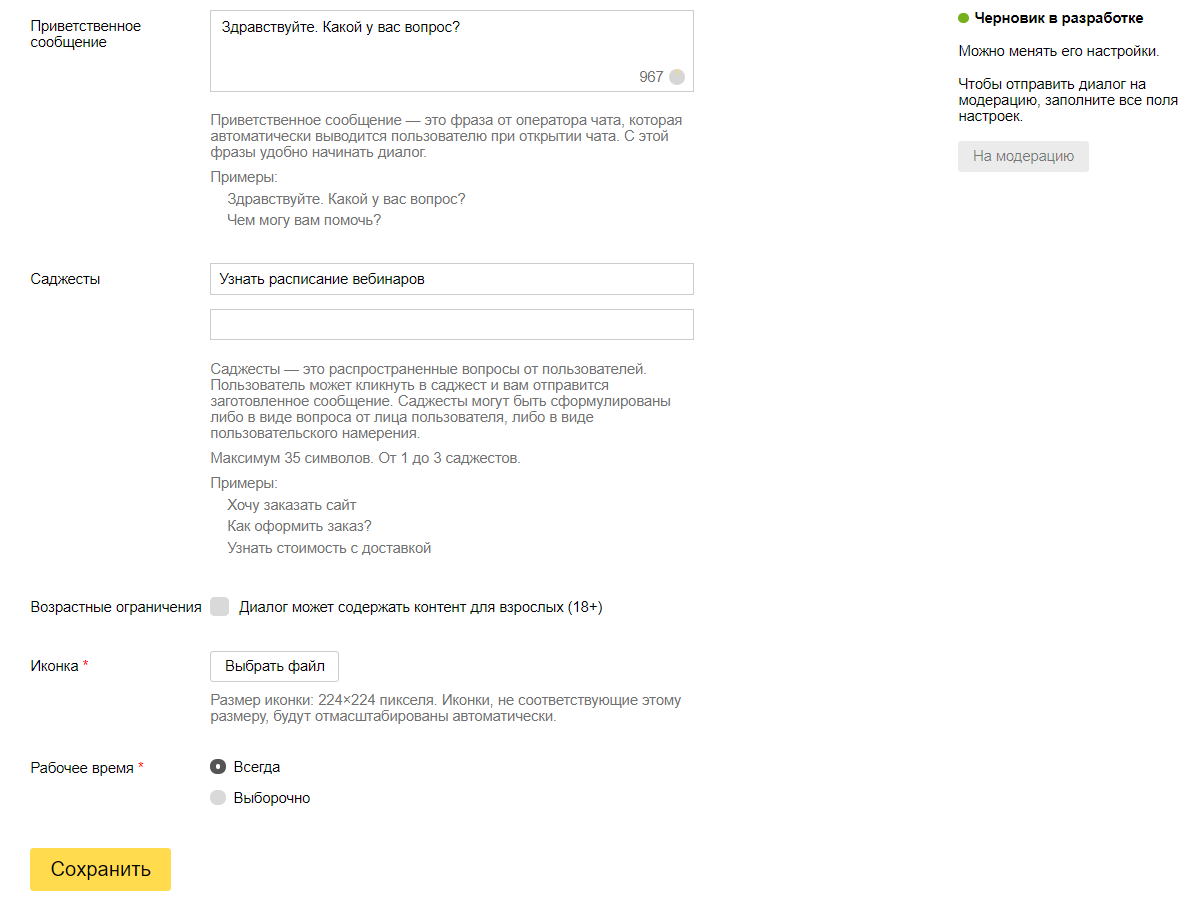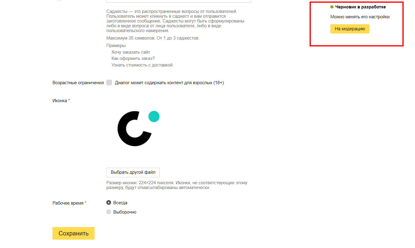 Модерация может занять до трех рабочих дней. Когда Яндекс одобрит чат, запустите его работу кнопкой «Опубликовать». На публикацию может потребоваться до часа.