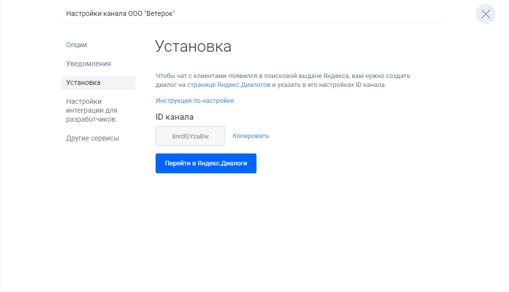 После этого мы сможем увидеть сгенерированный ID канала, скопировать его и затем перейти в «Яндекс. Диалоги» для дальнейшей работы на его стороне.