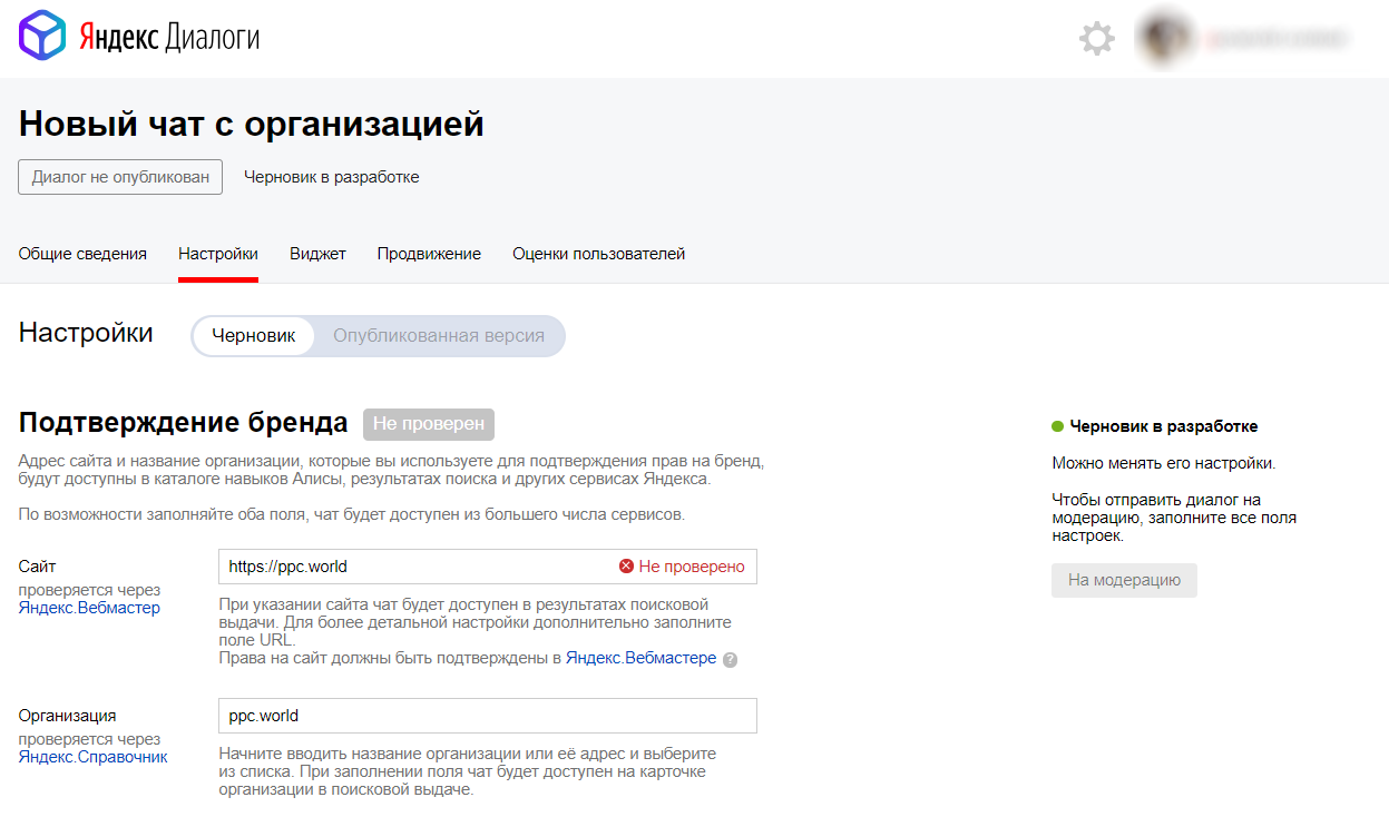 3. Переходим к настройкам чата. В первую очередь нужно указать адрес сайта и название организации. Яндекс.Диалоги автоматически проверяют информацию.