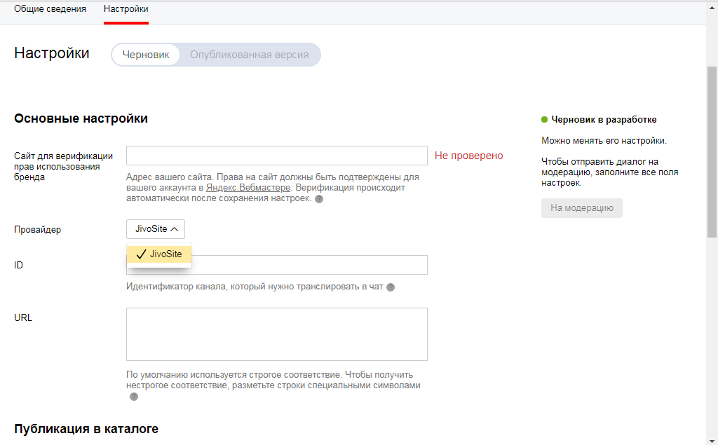 Следующий раздел – «Публикация в каталоге». Здесь разработчик прописывает наименование компании, для которой он создает чат, и название диалога, которое будет отображаться в заголовке чата.