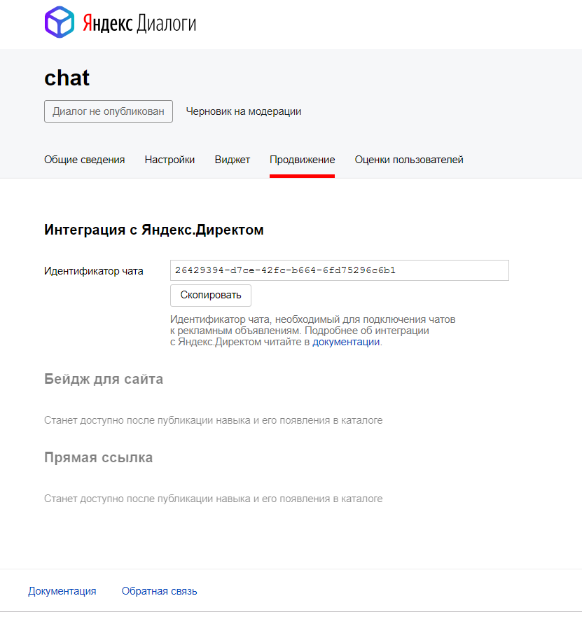 9. У созданного диалога появится идентификационный номер, необходимый для включения опции в Директе. Скопируйте его в разделе «Продвижение».