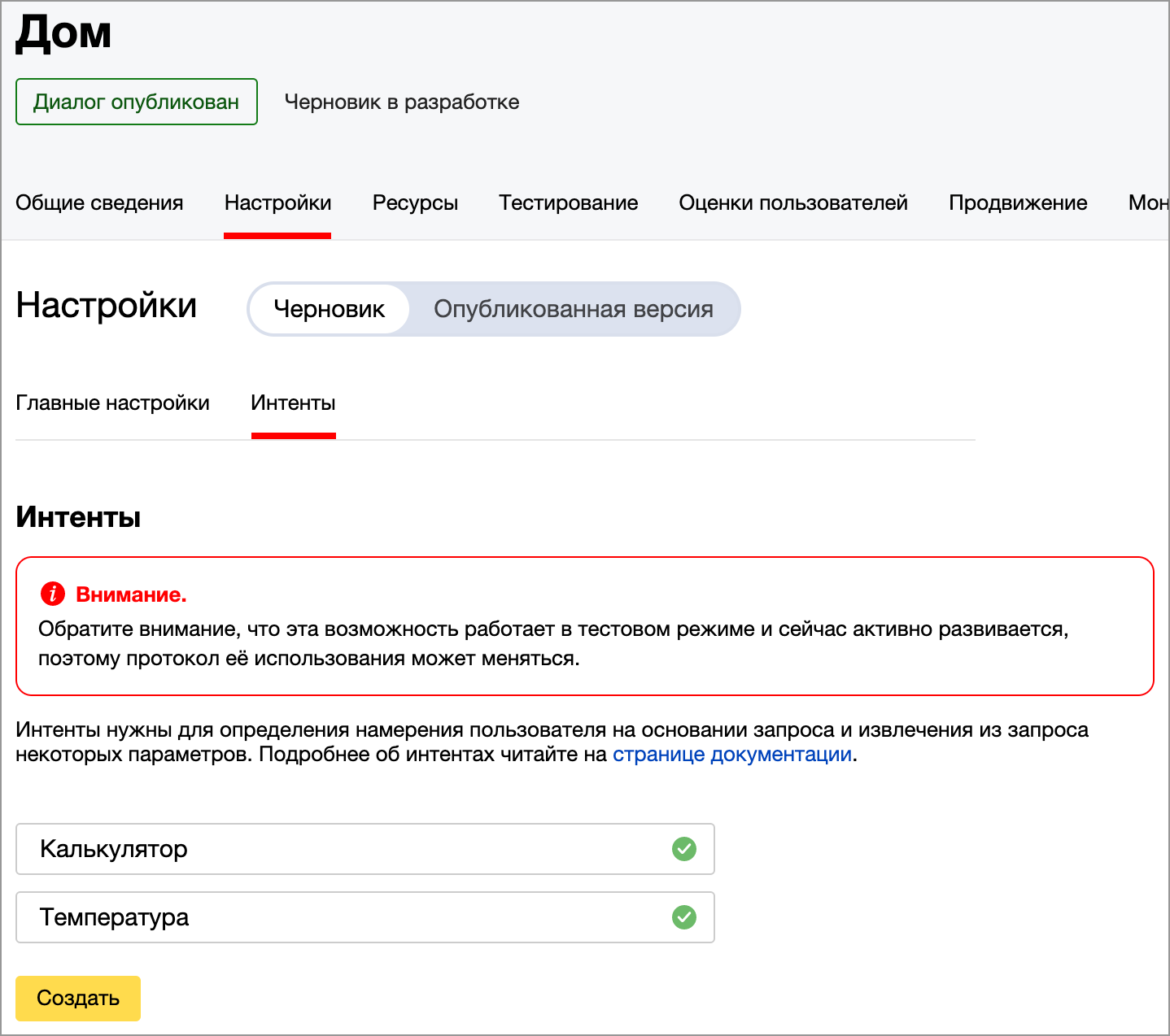 Интенты можно настраивать только после публикации навыка. Любые изменения в интентах требуют новой публикации (занимает пару минут).