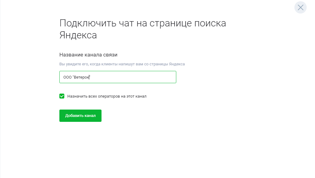 На странице вводим название канала связи, например «Чат ООО «Ветерок» и жмем «Добавить канал».