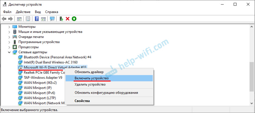 Ну вручную включать его не нужно. Разве что кто-то его до вас отключил. В таком случае, в диспетчере устройств он будет отображаться с иконкой в виде стрелки. Нужно нажать на виртуальный адаптер и выбрать «Включить устройство». Если в диспетчере устройств его вообще нет, включите «Показать скрытые устройства» в меню «Вид» (скриншот выше).