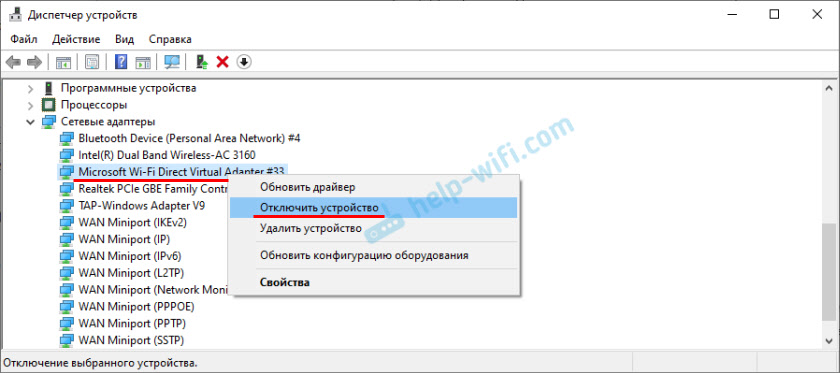 Как отключить? Вручную отключать, или тем более удалять этот виртуальный адаптер от Майкрософт не нужно. Но если очень хочется, то можно попробовать сделать это в том же диспетчере устройств. Достаточно нажать правой кнопкой мыши на адаптер и выбрать «Отключить устройство».