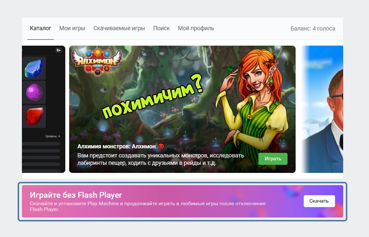 Зайдите в каталог игр vk.com/games с компьютера. Нажмите «Скачать» на баннере «Играйте без Flash Player».