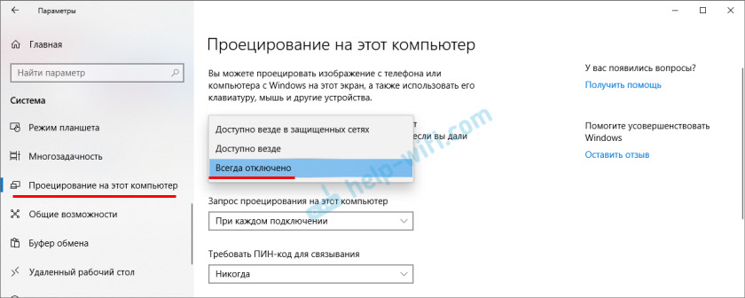 Чтобы этот виртуальный Wi-Fi Direct адаптер не отображался в диспетчере устройств, достаточно отключить мобильный хот-спот (в параметрах, в разделе «Сеть и интернет» – «Мобильный хот-спот») и отключить проецирование на этот компьютер. Сделать это можно в параметрах, в разделе «Система» – «Проецирование на этот компьютер». Нужно установить «Всегда отключено».