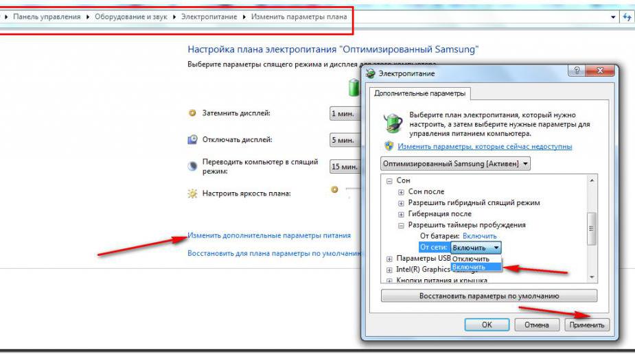 Предварительно следует зайти в раздел электропитания, в настройках текущей схемы перейти к дополнительным параметрам, в выведенном списке найти пункт сна и отметить галочкой строку разрешения таймеров сна. После этого можно приступать к действиям с планировщиком заданий.