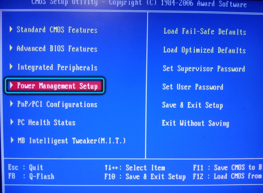 После нажатия соответствующей клавиши человеку нужно в открывшемся меню найти раздел «Power Management Setup». Появится системное окно. Здесь нужно выбрать «PWRON After PWR-Fail».