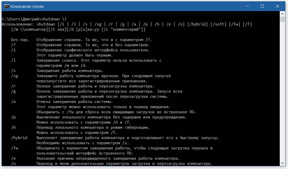 Теперь мы в командной строке Windows. Все дальнейшие действия мы будем выполнять именно здесь. Для начала вводим «shutdown \?». Эта команда позволит нам понять с какими ключами можно использовать «shutdown».