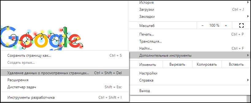 - Наводим курсор на «Дополнительные инструменты» и выбираем пункт «Удаление данных о просмотренных страницах».