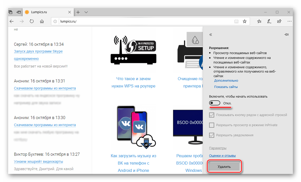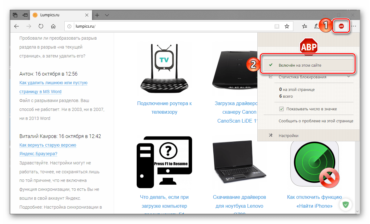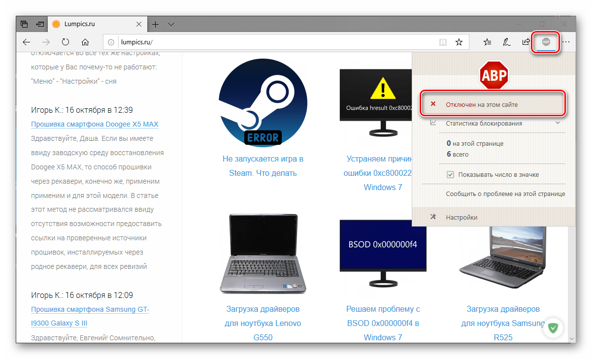 Стандартный для Windows 10 веб-обозреватель Microsoft Edge тоже поддерживает установку расширений, имеется в их числе и рассматриваемый нами блокировщик рекламы AdBlock. При необходимости его можно легко отключить для всех или любого произвольного сайта.