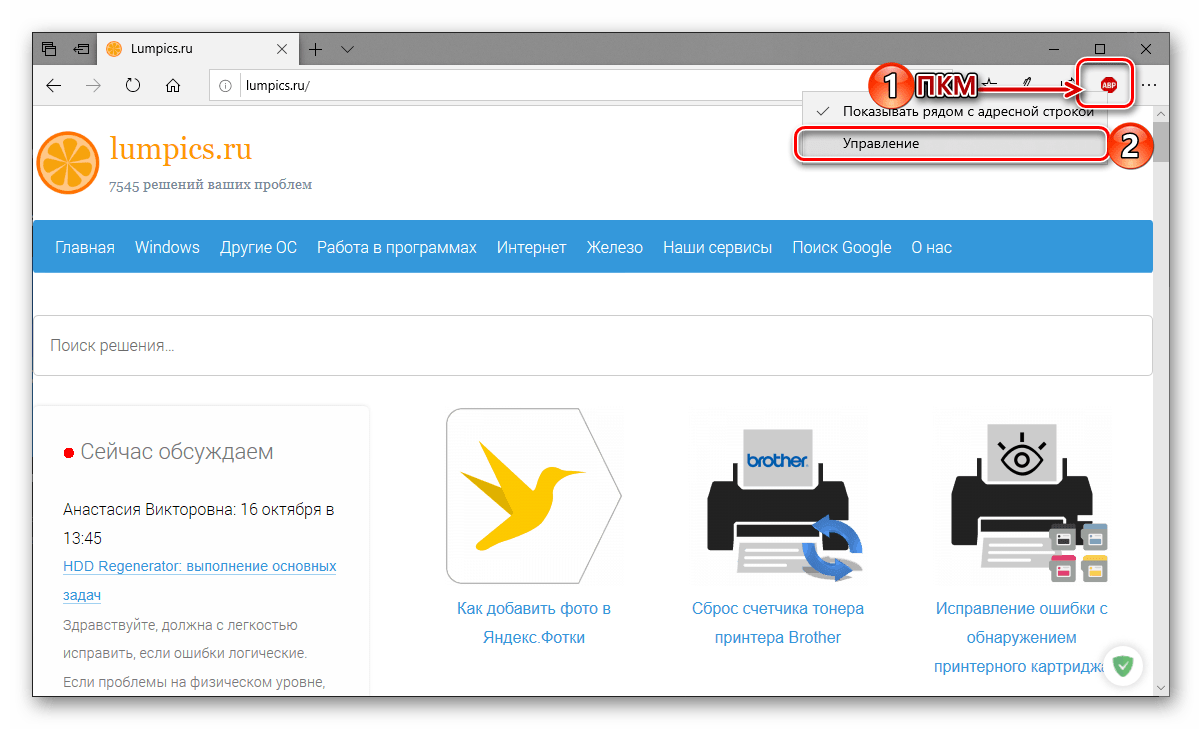 - В этот раз по значку расширения AdBlock потребуется нажать правой кнопкой мышки (ПКМ), а затем в появившемся меню выбрать пункт «Управление».