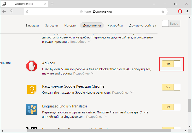Найти в списке расширений AdBlock и нажать «Отключить» под ним.