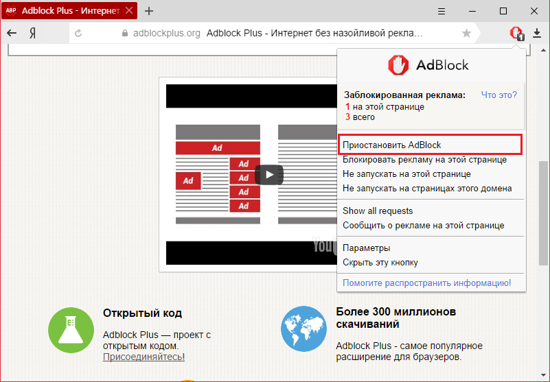 Отключение этого плагина в Яндекс Браузере практически такое же, как и в Google Chrome. Нажимаем левой кнопкой на иконку АдБлока и жмем «Приостановить».