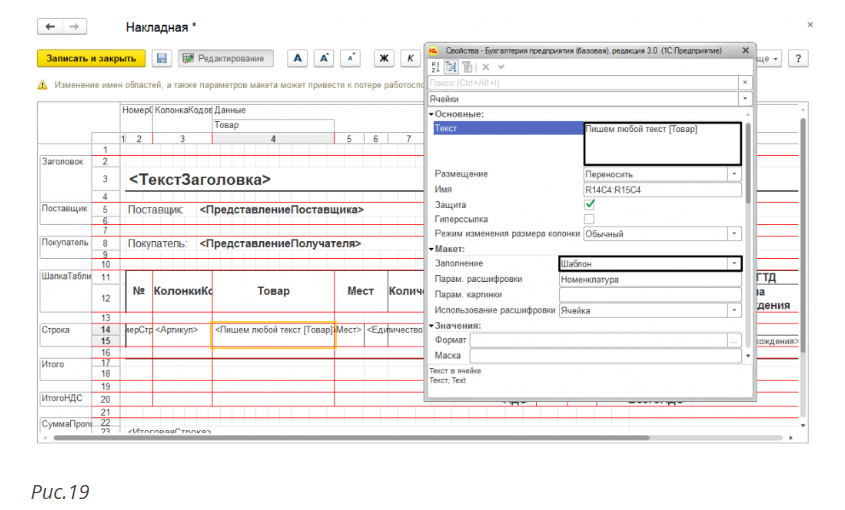 На экране появилось окно, в котором видно, что значение ячейки <Товар> — это параметр. Но задать можно не только параметры и текст, также в макете для ячейки возможно задать шаблон, в свойствах должно быть указано, что это именно шаблон. При использовании шаблона можно скомбинировать параметры и текстовые значения. Для это нужно в значении ячейки товара отметить, что это шаблон, а при выборе значения шаблона в поле «Текст» при указании параметра использовать квадратные скобки.