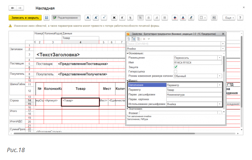 Таким образом пользователь самостоятельно способен добавить в макет какие-то значения для документа, при помощи параметров. Для того, чтобы удобнее было сориентироваться в параметрах, лучше просмотреть другие макеты документов. Например, для того чтобы в ячейку выводилась цена, артикул или товар, нужно просто указать необходимый параметр в ячейке.