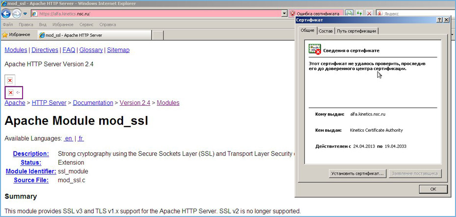 3. Если щелкнуть по сообщению «Ошибка сертификата и далее — «Просмотр сертификатов» , то увидим, что сертификат сайта alfa.сайт проверить не удалось,