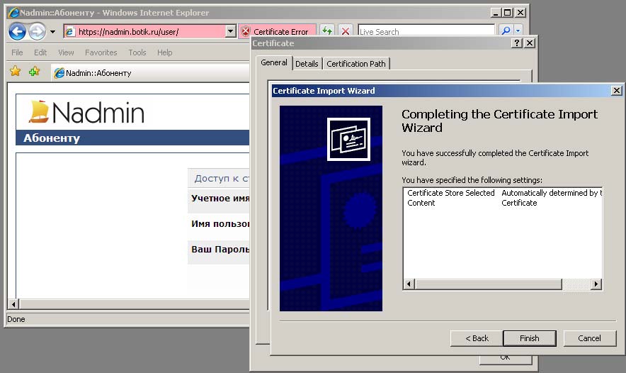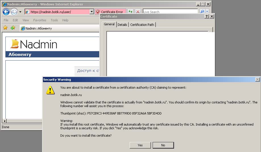 дМС УПИТБОЕОЙС УЕТФЙЖЙЛБФБ УЕТЧЕТБ nadmin.botik.ru Ч УРЙУЛЕ ДПЧЕТЕООЩИ УЕТЧЕТПЧ ОБ ДЙУЛЕ ЧБЫЕЗП ЛПНРШАФЕТБ ЭЕМЛОЙФЕ РП ЛОПРЛЕ Install Certificate.хУФБОПЧЙФШ УЕТФЙЖЙЛБФ ( УН. ТЙУ. 4). дБМЕЕ ВХДХФ ПРЙУБОЩ ДЕКУФЧЙС, ЛПФПТЩЕ ОБДП ЧЩРПМОЙФШ, ЕУМЙ ЧЩ ТБВПФБЕФЕ Ч пу Windows XP . дМС пу Windows Vista ДБМШОЕКЫЙЕ ДЕКУФЧЙС ПРЙУБОЩ ЪДЕУШ.