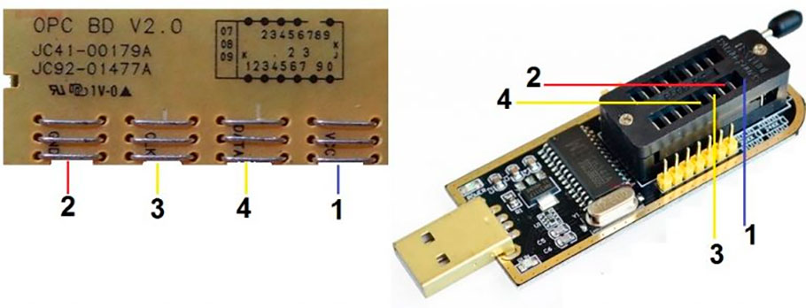 Во многих случаях для прошивки микросхем требуется не только работать с программатором, но и с паяльником (выпаивать схемы, делать различные распайки и т.д.). В случае прошивки Samsung SCX-4200, потребуется припаять проводки к контактам чипа картриджа (либо подсоединить при помощи специальных прищепок). Другой конец проводков подсоединяется к контактной площадке программатора по схеме: