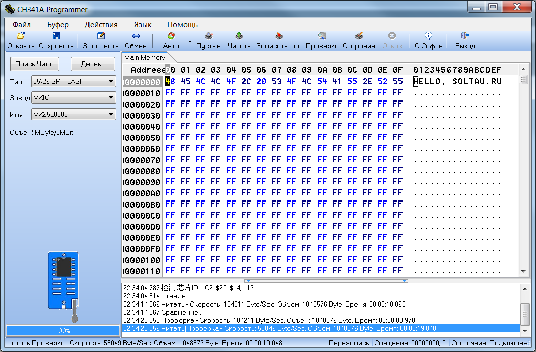 Можно убедиться в том, что данные успешно записаны, отключив программатор от компьютера, а затем подключив его и заново считав содержимое ПЗУ.