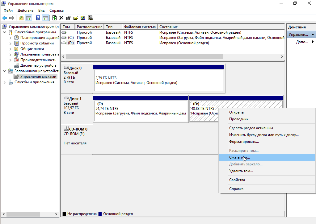 Кликните по нужному диску правой кнопкой и выберите опцию Сжать том: