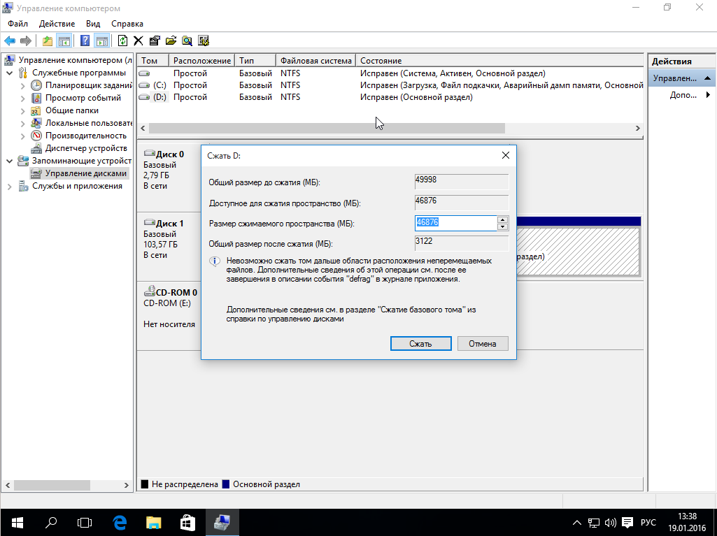 Если удаление данных невозможно, и на накопителе присутствует ценная информация (например, диск был необходим для стандартного хранения файлов), необходимо осуществить сжатие занятого раздела, чтобы высвободить дополнительное необходимое пространство. Используют два варианта – встроенные утилиты операционки Виндовс или сторонние программы. В первом случае пользователь должен выполнить следующее: