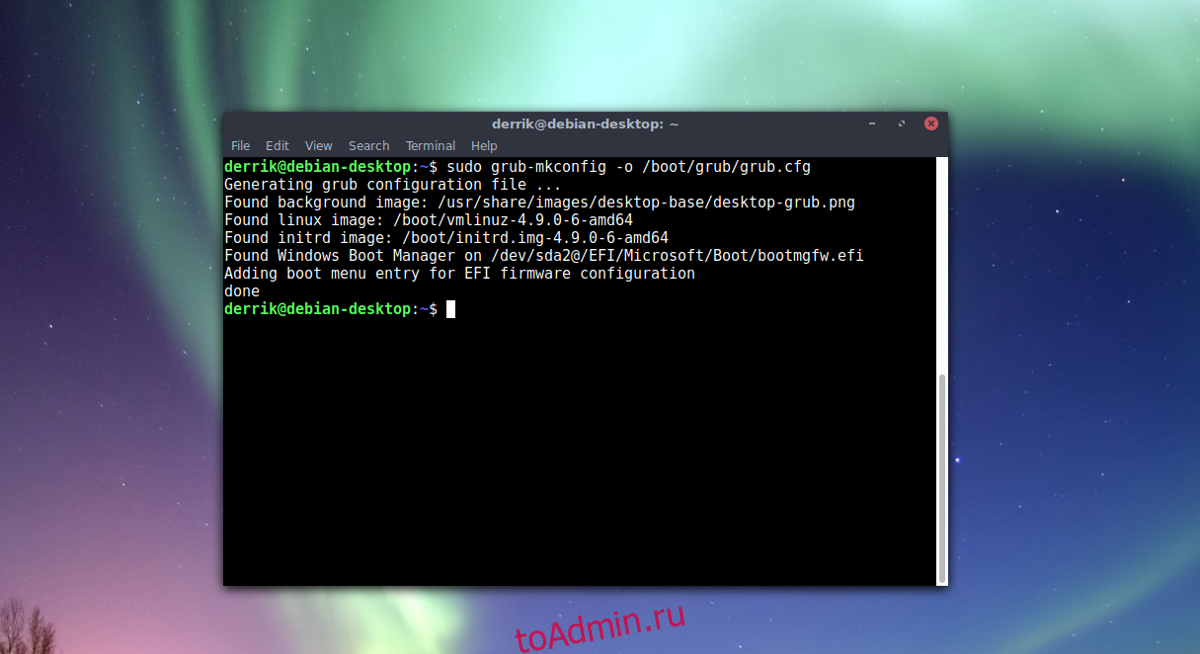 Примечание: в вашей операционной системе может быть официальная команда «update-grub». Обязательно проверьте официальную Wiki для вашей операционной системы, прежде чем продолжить. Большинство установок Grub в Linux находятся в / boot / grub /, поэтому следующая команда должна работать правильно для обновления Grub.