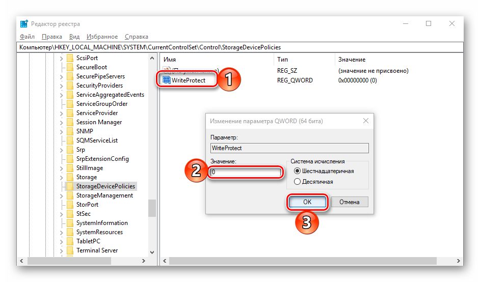 С помощью боковой панели перейдите в каталог: HKEY_LOCAL_MACHINE\SYSTEM\CurrentControlSet\Control\StorageDevicePolicies. Когда увидите параметр WriteProtect, откройте его двойным щелчком мыши и убедитесь, что его значение равно нулю. Если необходимо, измените его и нажмите ОК.