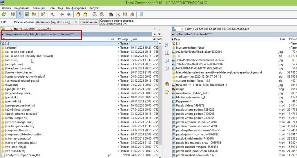 Далее все собственно просто как в «Мой компьютер» — перетаскивайте нужные вам файлы с сервера или на него, путешествуйте по папкам и тд и тп.