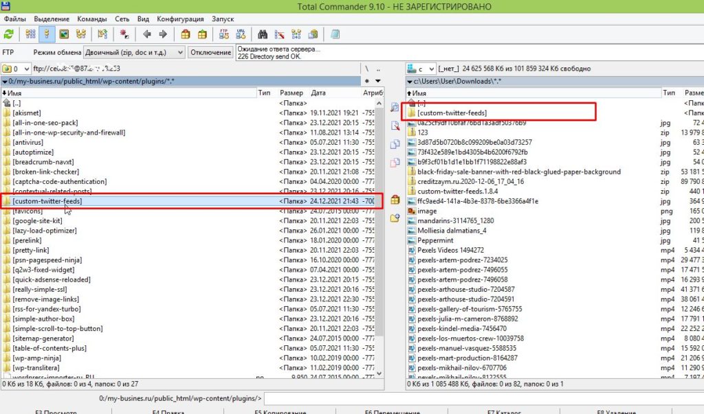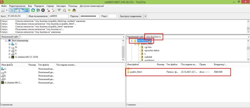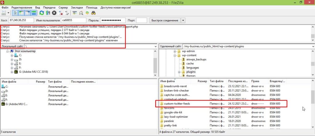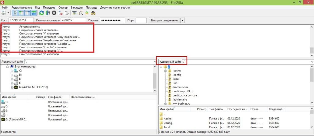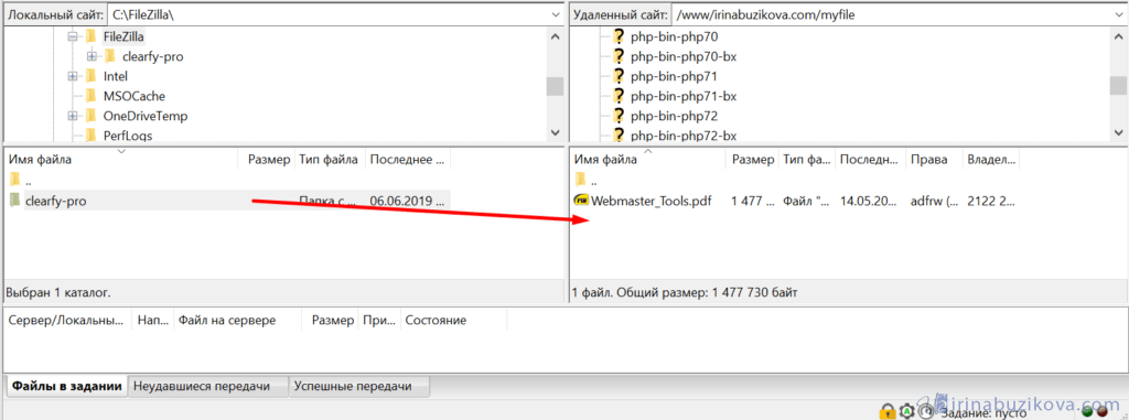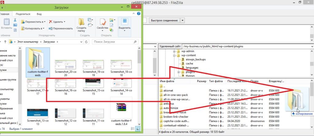 После подключения приступаем к передаче файлов на сервер и обратно. Это возможно двумя способами. В окнах открываем необходимые папки. И простым перетягиванием отправляем папку на удаленный сервер.