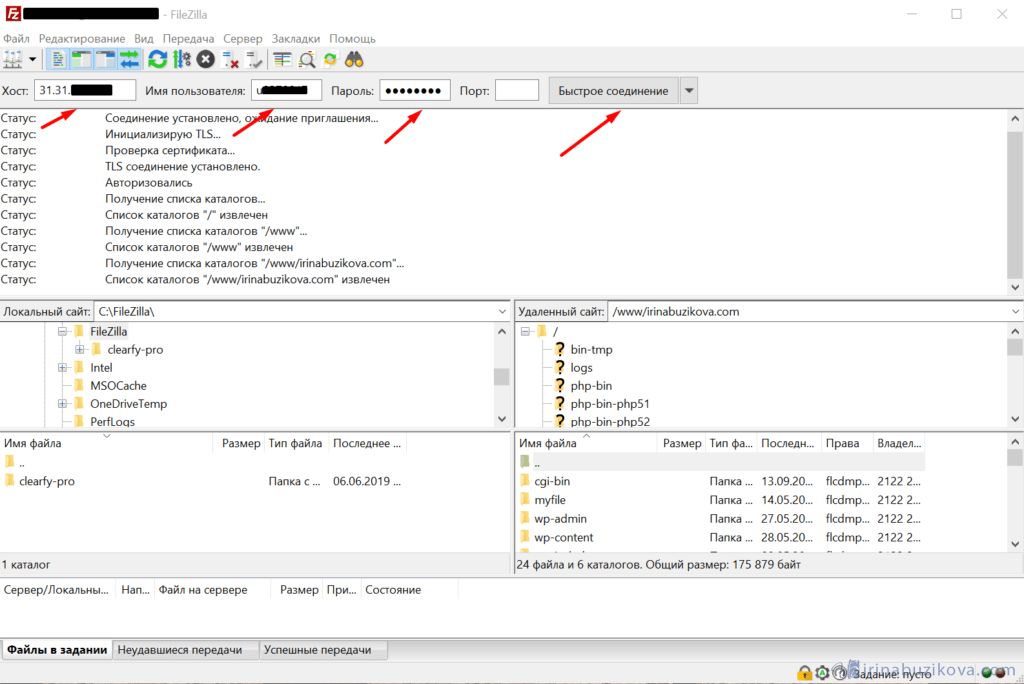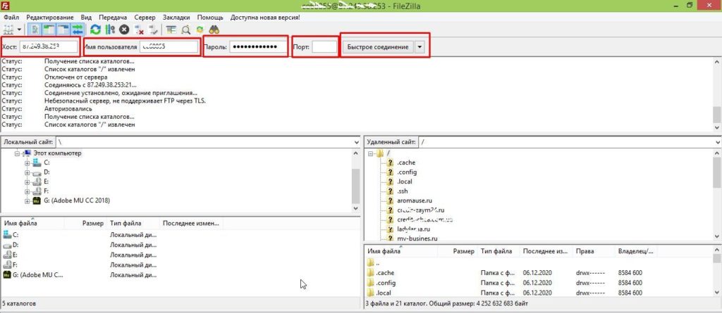 Можно воспользоваться «Быстрым соединением», которое доступно в верхней части окна. Требуется внести «Хост», «Имя пользователя», «Пароль», «Порт» — необязательно, так как при пустом поле ввода используется порт по умолчанию!Примечание! Все данные для подключения к FTP серверу Вам как пользователю хостинга или другой соответствующей услуги должен предоставить провайдер, имеющий доступ Администратора к серверам. Обычно, вся информация для FTP доступна сразу после регистрации или после распространения зоны DNS (за редкими исключениями информация может выдаваться по требованию).