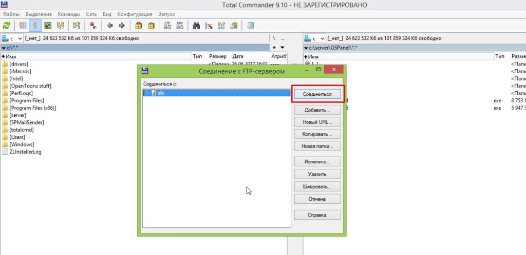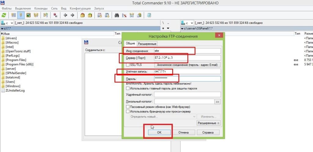Для настройки FTP через Total Commander остальные опции трогать не надо. Просто, когда ввели все данные, нажмите «Ок», и тогда ваше новое соединение появится в списке. Чтобы подключиться, выделите его, и нажмите на кнопку «Соединиться». Начнётся подключение, при успешном результате которого вы увидите корневую папку своего сайта.