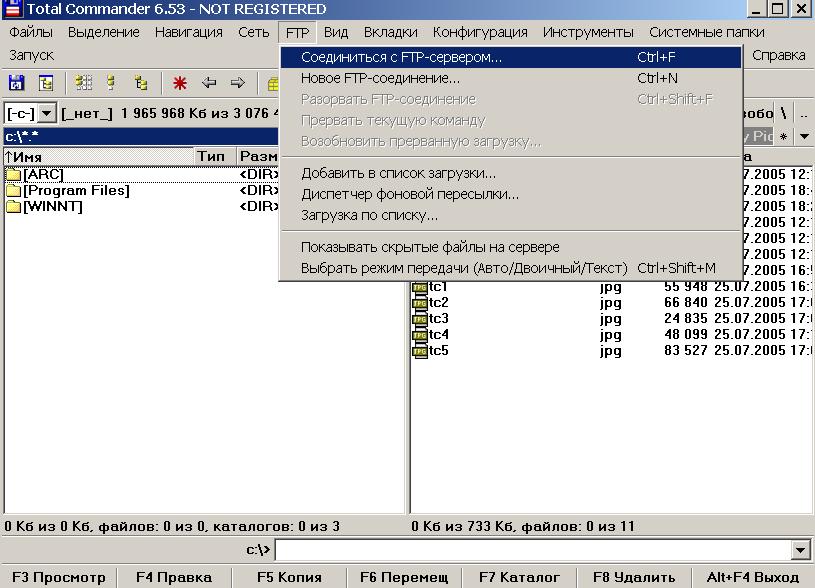 3. В верхнем меню нажмите пункт FTP и выберите строку Соединиться с FTP-сервером.