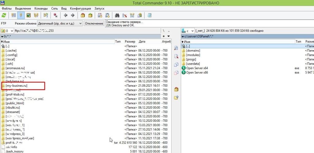 После того как вы успешно соединились со своим сервером, в окне Total Commander увидите корневую директорию своего сайта.