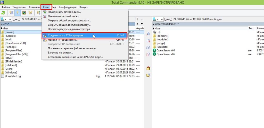Когда вы скачали Total Commander, его нужно установить на компьютер. После установки открываем программу и в верхнем меню ищем «Сеть», а затем «Соединиться с FTP-сервером».