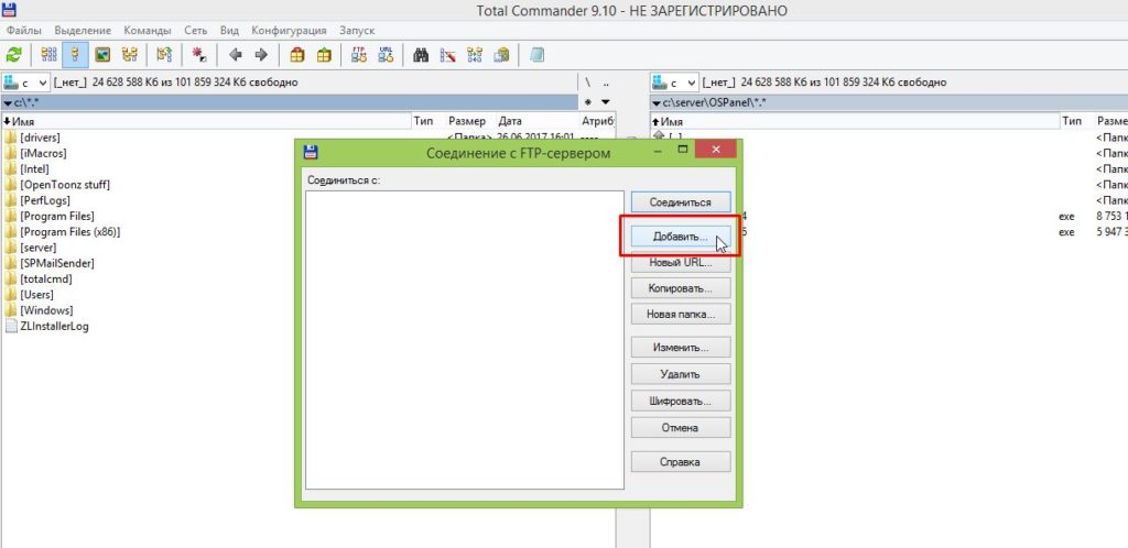 Для добавления и настройки нового FTP соединения скачайте и запустите Total Commander. В верхнем меню выберите – Сеть – Соединиться с FTP сервером или нажмите CTRL+F на клавиатуре. Перед вами появится окошко, где выберите – Добавить.