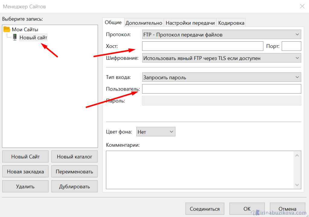 Откроется окно менеджера в котором потребуется внести данные для подключения. Для того чтобы начать создание нового профиля нажимаем кнопку «Новый сайт» в нижней области окна.