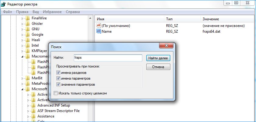 Наберите в поле Fraps и кликните на кнопку «Найти». Когда будет найден параметр или раздел, щелкните на нем правой кнопкой мыши и выберите «Удалить».