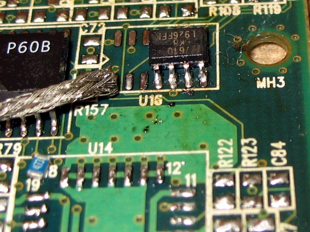 Контакты микросхемы у нас при этом замкнутся, но это не страшно, после того как демонтируем микросхему, мы легко с помощью демонтажной оплетки, уберем излишки припоя с контактов на плате, и с контактов на микросхеме.
