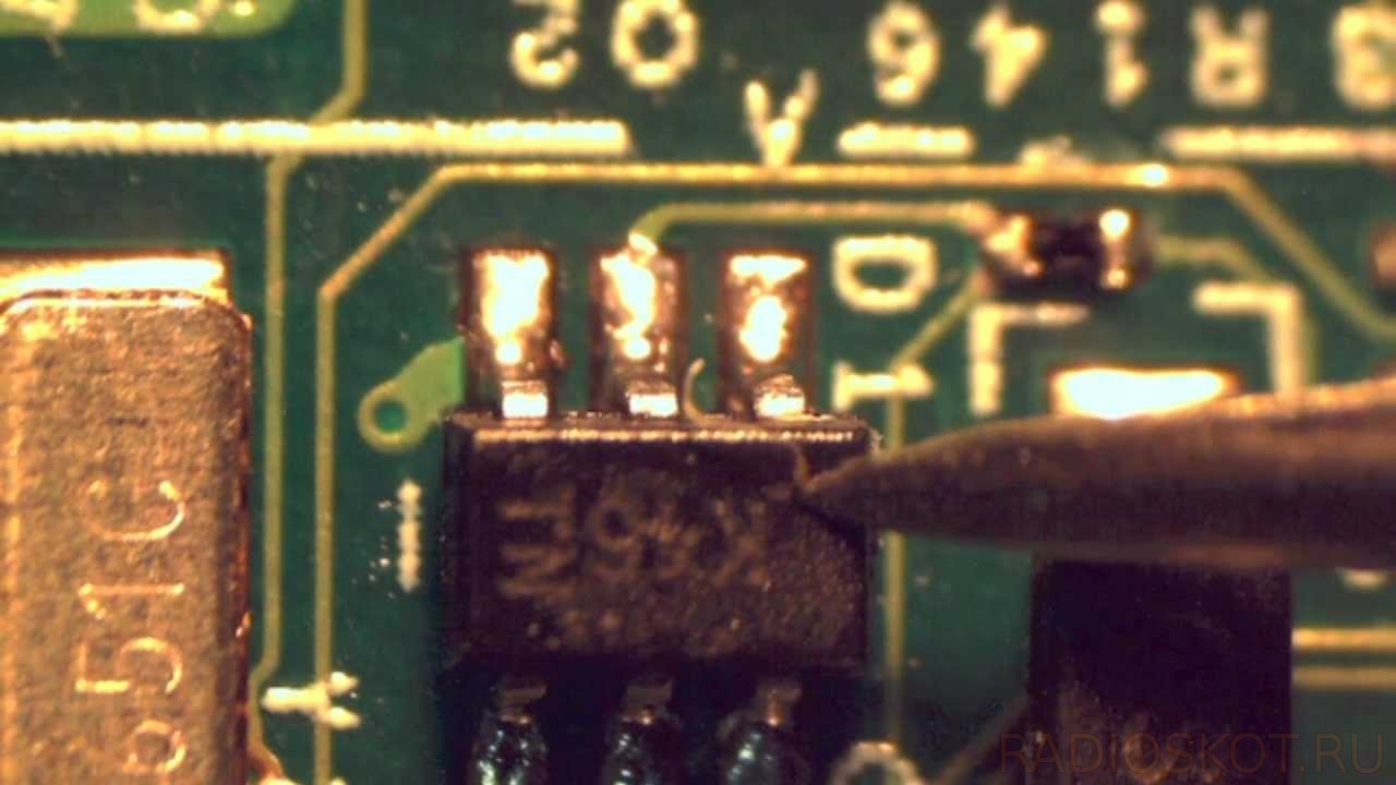 С транзисторами дела обстоят точно также. Капаем на все 3 вывода припоем и извлекаем радиодеталь из платы.