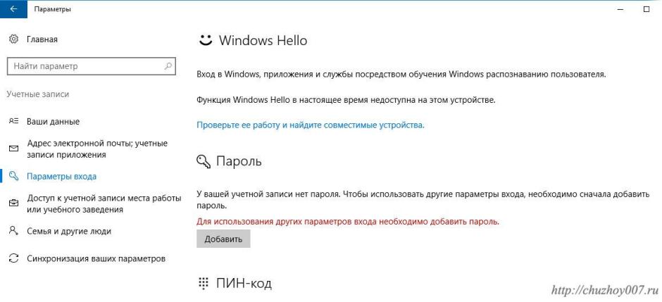 Выбрать раздел «Учётные записи» и здесь мы увидим, что сама виндовс предупреждает нас о необходимости добавления пароля, что бы можно было использовать все параметры.