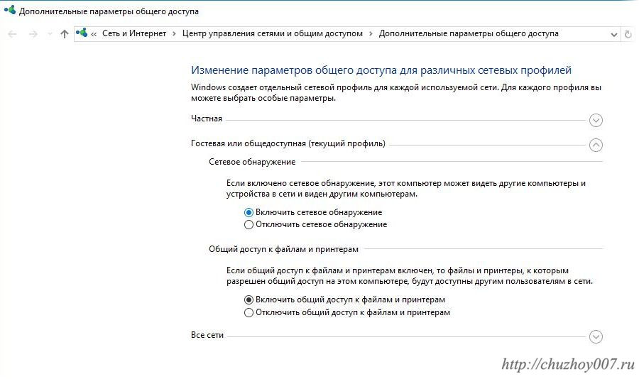 Выберите «Параметры общего доступа». В текущем профиле, в моем случае это гостева, «Гостевая или общедоступная (текущий профиль)» включите кнопки «Включить сетевое обнаружение» и «Включить общий доступ к файлам и принтерам».
