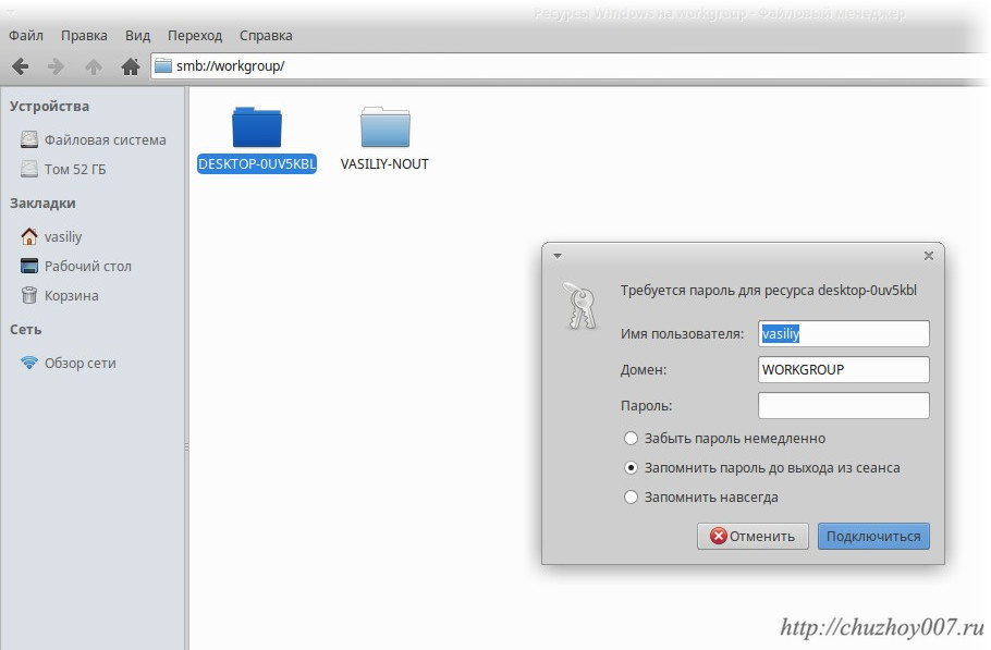 Здесь находится и та самая «Общая папка» которую я расшарил для доступа к ней по сети из под xubuntu. Открываем её. И вновь открывается диалоговое окно в котором включаете кнопку «Подключиться как» и ещё раз ввести пароль пользователя windows. Если папку планируется использовать постоянно то можно ещё включить кнопку «Запомнить навсегда»